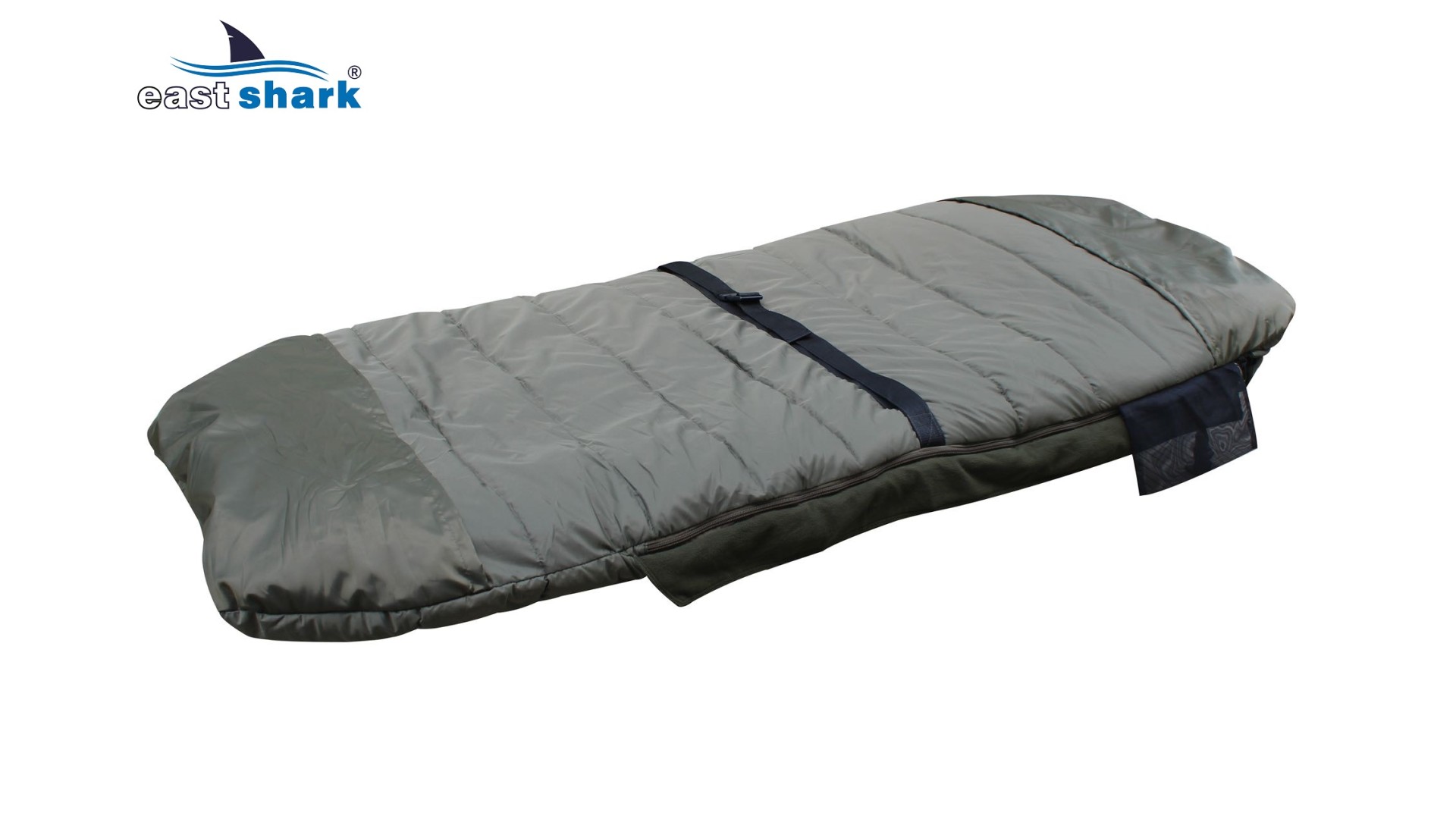Задняя часть спальника имеет 2 кармана (вверху и внизу) и ремень для фиксации на раскладушке.