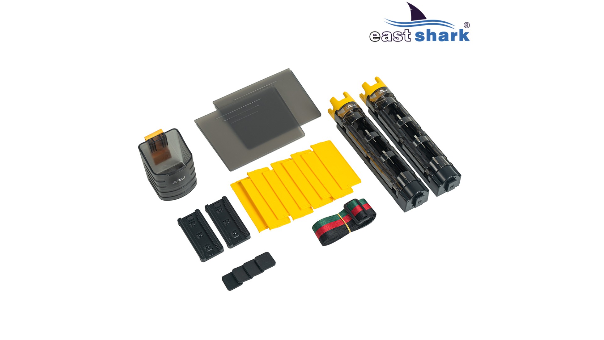 В комплектацию с ящиком входят: 2 навесных держателя удилища с возможностью регулировки высоты и соединителями, 1 емкость навесная с креплением 10*8*8 см, плечевой ремень, 4 резиновых пятака на дно ящика, 8 малых перегородок в малый отдел и 2 перегородки для большого отдела.